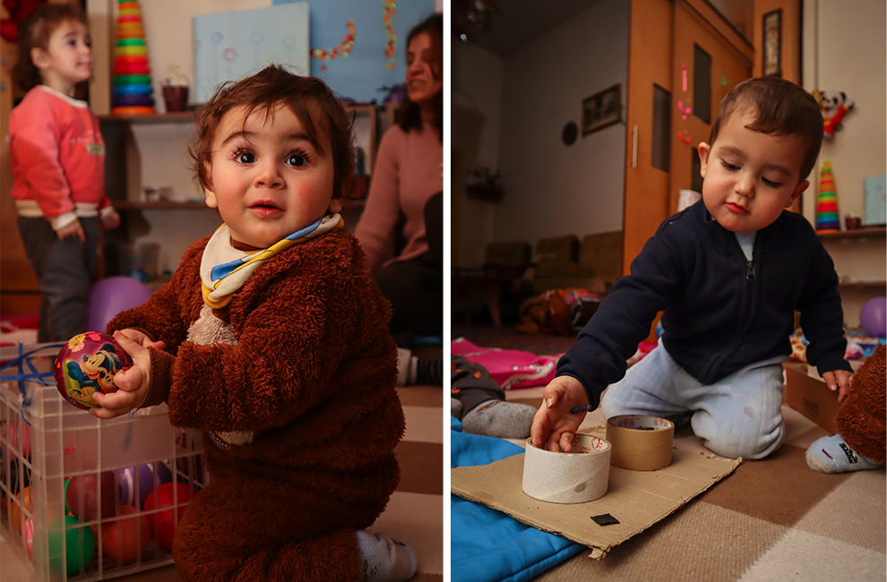 Two young children play with colourful toys at a community-based early learning centre in Salamieh, Syria. In areas where years of conflict and economic hardship have strained public services, centres like this provide safe, nurturing spaces for young children to learn and grow.