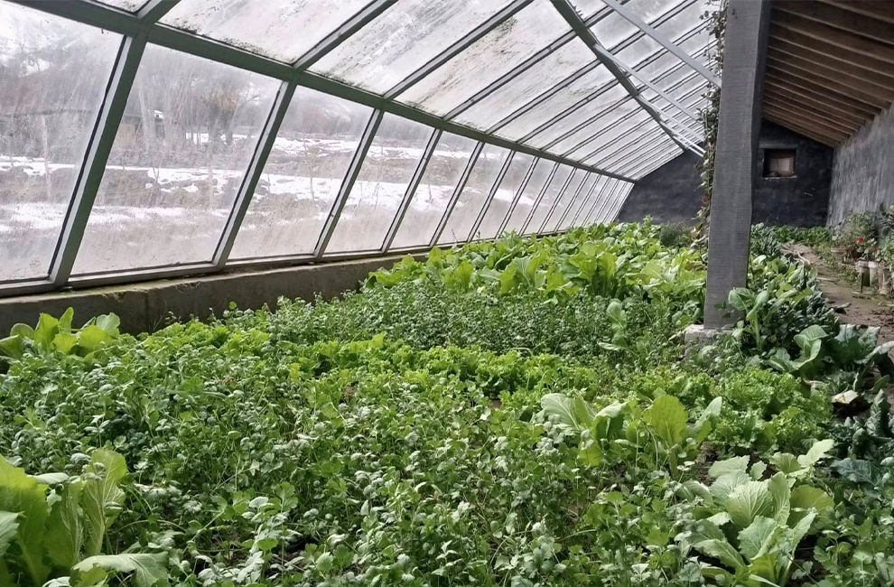 Fresh green vegetables flourish inside a passive solar greenhouse in northern Pakistan as winter snow blankets the valley outside. In the high-altitude regions of Gilgit-Baltistan and Chitral, where temperatures fall well below freezing and roads, fields and irrigation channels are often blocked for months, families face limited access to fresh food and rising household costs.
