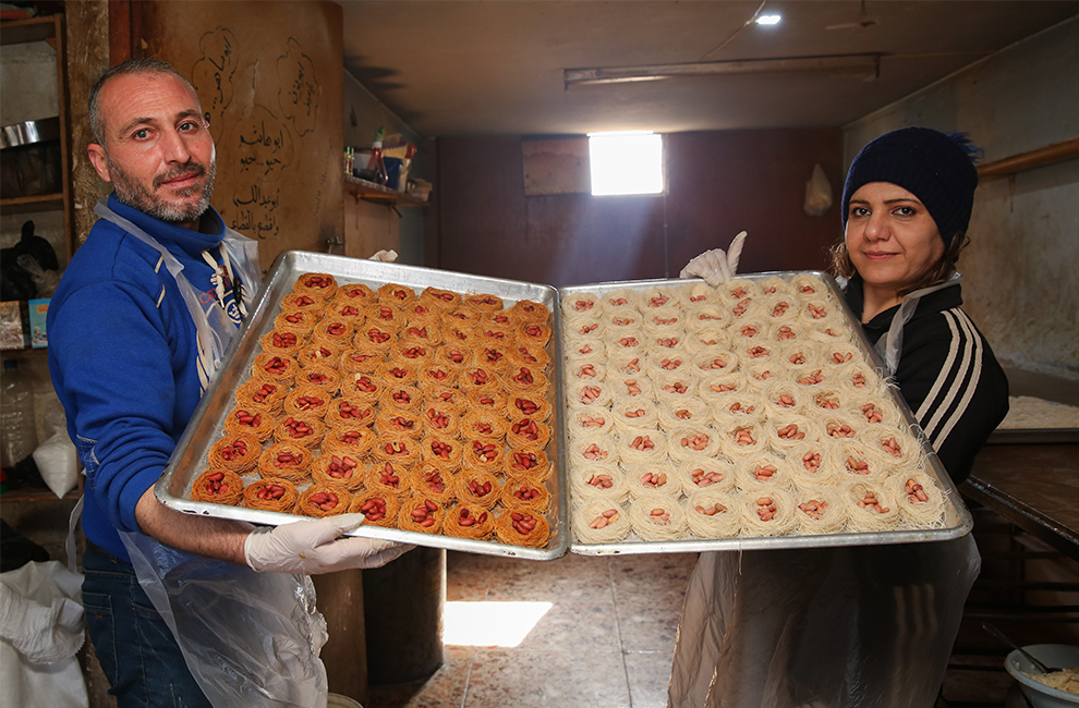 A business owner (right) and her colleague hold trays of freshly made sweet pastries at their workshop in Barri Sharqi village. In a context of prolonged economic hardship and limited job opportunities in Syria, small food businesses like this provide a vital source of income for families and their wider community.