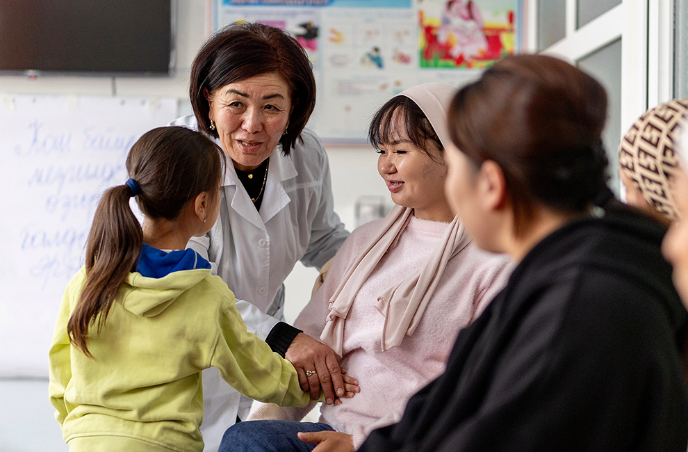 During a session for pregnant women at the Parent’s School, a facility in the Ak-sy District Hospital in Kerben, Dr. Ainura shows a girl how to rub her mother’s belly. Support from AKF has helped procure equipment for facilities like this and have helped healthcare workers like Dr. Ainura access more training on maternal care and early childhood development. Sessions at the Parent’s School run every day and are tailored to specific topics like nutrition and prenatal exercises.