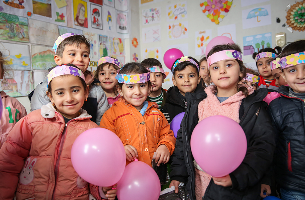 Children wear their hand-crafted headbands at a community-based childcare centre in Salamieh. Supported by AKF, centres like this one lead interactive sessions which champion children’s emotional wellbeing, playful and inclusive learning, and positive parental and community engagement.