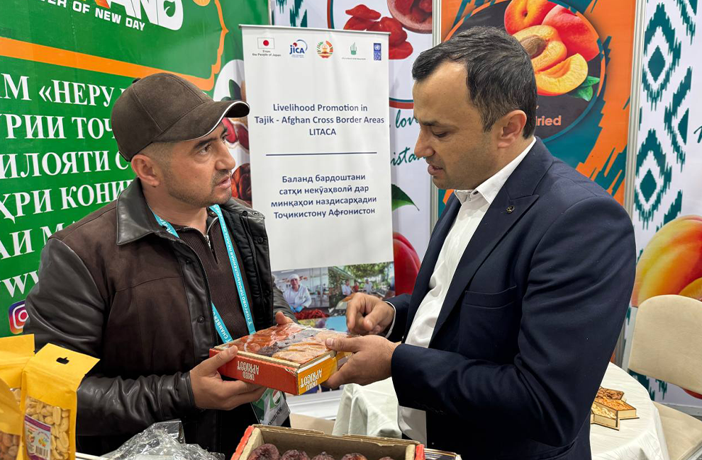 Navruz (left) presents his sweet, dried apricots to an international buyer at an investment exhibition in Tajikistan’s capital, Dushanbe. Each year, Navruz currently exports 200-250 tons of dried apricots, mulberries, cherries and more to Russia, Belarus and Turkey. His business, which started small in his home village of Ponghoz – a place famous for its fragrant orchards – now employs 60 people, including 54 women, and is recognised for its quality on a global stage.