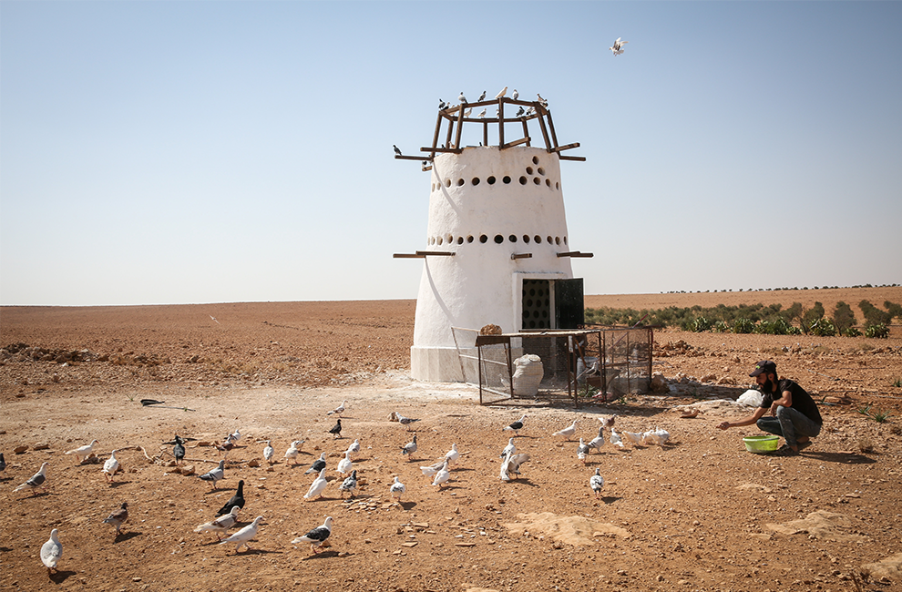 A farmer feeds his pigeons in front of his pigeon tower, constructed using locally available resources. In rural Hama, pigeon breeding is emerging as a climate-adapted livelihood, with pigeons providing a sustainable source of protein and a steady income in increasingly arid areas. Surplus birds and chicks can be sold on, further strengthening the income stream.
