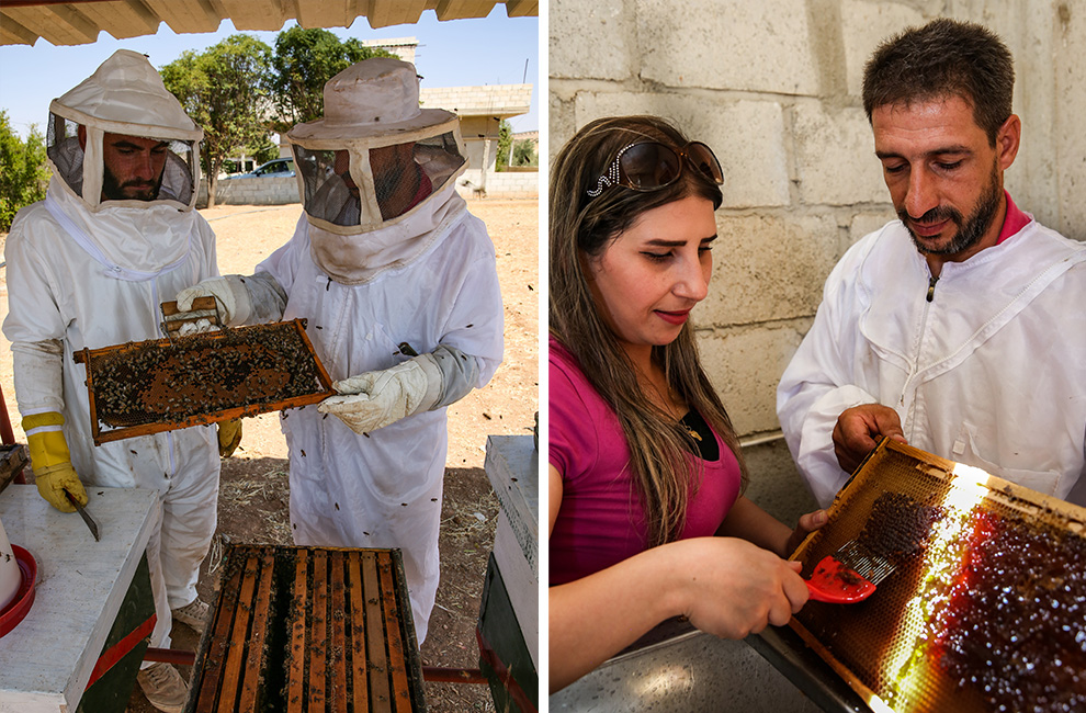Members of a Community Interest Group (CIG) collect honey from their beehives – a sustainable and climate-friendly income-generating activity. Against Syria’s complex economic backdrop, CIGs offer communities an opportunity to come together and establish small businesses and income-generating cooperatives to build financial resilience. AKF is supporting CIGs with grants, market access, and business plan development, strengthening production, profitability, and community engagement.